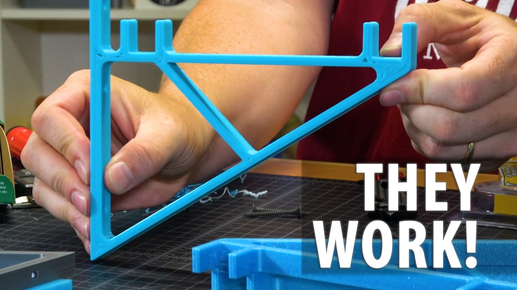 The shelf bracket model is fully 3d printable. It's built for 1x2 lumber, and has been tested to hold at least 20 pounds at the front when printed in PLA.
